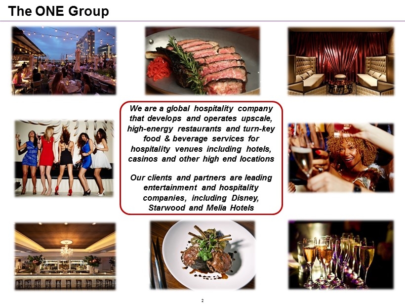 We are a global hospitality company that develops and operates upscale, high - energy restaurants and turn - key food & beverage services for hospitality venues including hotels , casinos and other high end locations Our clients and partners are leading entertainment and hospitality companies, including Disney, Starwood and Melia Hotels The ONE Group 2