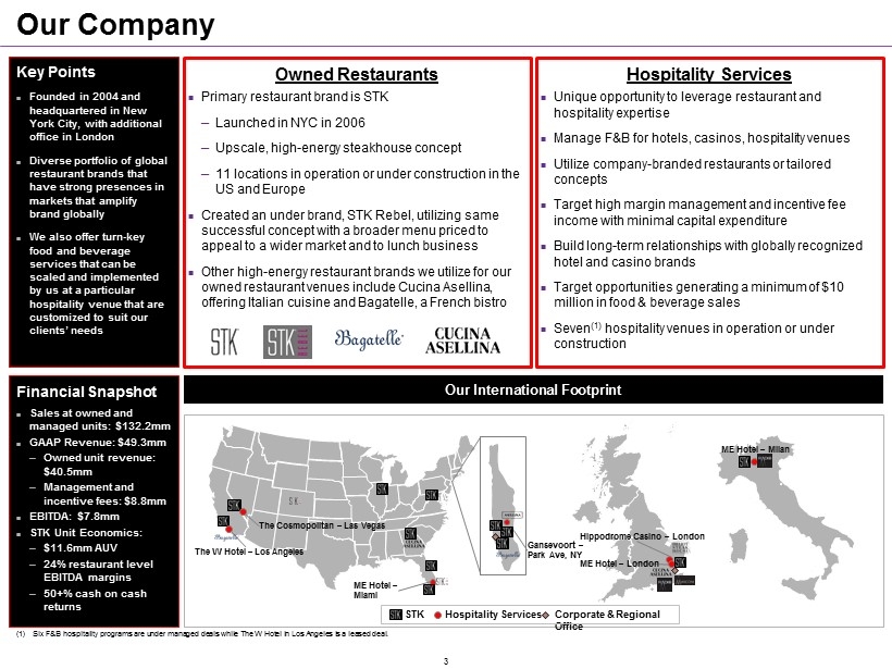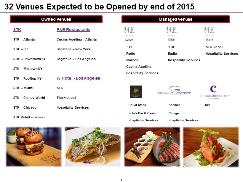 Our Company Owned Restaurants Primary restaurant brand is STK ─ Launched in NYC in 2006 ─ Upscale, high - energy steakhouse concept ─ 11 locations in operation or under construction in the US and Europe Created an under brand, STK Rebel, utilizing same successful concept with a b roader menu priced to appeal to a wider market and to lunch business Other high - energy restaurant brands we utilize for our owned restaurant venues include Cucina Asellina, offering Italian cuisine and Bagatelle, a French bistro Hospitality Services Unique opportunity to leverage restaurant and hospitality expertise Manage F&B for hotels, casinos, hospitality venues Utilize company - branded restaurants or tailored concepts Target high margin management and incentive fee income with minimal capital expenditure Build long - term relationships with globally recognized hotel and casino brands Target opportunities generating a minimum of $ 10 million in food & beverage sales Seven (1) hospitality venues in operation or under construction Key Points Founded in 2004 and headquartered in New York City, with additional office in London Diverse portfolio of global restaurant brands that have strong presences in markets that amplify brand globally We also offer turn - key food and beverage services that can be scaled and implemented by us at a particular hospitality venue that are customized to suit our clients’ needs Our International Footprint ME Hotel – Miami Gansevoort – Park Ave, NY Hippodrome Casino – London ME Hotel – London Corporate & Regional Office STK Hospitality Services The Cosmopolitan – Las Vegas ME Hotel – Milan The W Hotel – Los Angeles Financial Snapshot Sales at owned and managed units: $132.2mm GAAP Revenue: $49.3mm ─ Owned unit revenue: $40.5mm ─ Management and incentive fees : $8.8mm EBITDA : $7.8mm STK Unit Economics: ─ $11.6mm AUV ─ 24% r estaurant l evel EBITDA margins ─ 50+% cash on cash returns (1) Six F&B hospitality programs are under managed deals while The W Hotel in Los Angeles is a leased deal. 3
