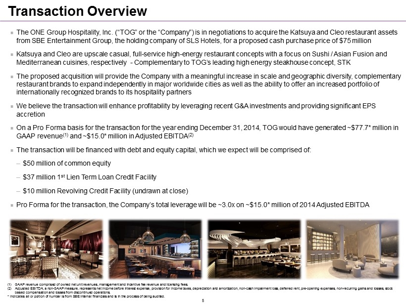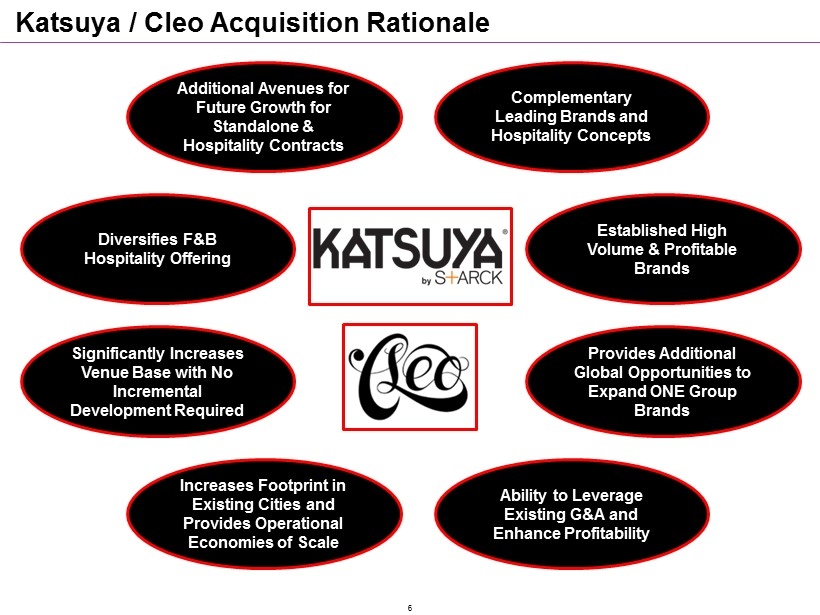 Transaction Overview The ONE Group Hospitality, Inc. (“TOG” or the “Company”) is in negotiations to acquire the Katsuya and Cleo restaurant assets from SBE Entertainment Group, the holding company of SLS Hotels, for a proposed cash purchase price of $75 million Katsuya and Cleo are upscale casual, full - service high - energy restaurant concepts with a focus on Sushi / Asian Fusion and Mediterranean cuisines, respectively - Complementary to TOG’s leading high energy steakhouse concept, STK The proposed acquisition will provide the Company with a meaningful increase in scale and geographic diversity, complementary restaurant brands to expand independently in major worldwide cities as well as the ability to offer an increased portfolio of internationally recognized brands to its hospitality partners We believe the transaction will enhance profitability by leveraging recent G&A investments and providing significant EPS accretion On a Pro Forma basis for the transaction for the year ending December 31, 2014, TOG would have generated ~$77.7* million in GAAP revenue (1) and ~$15.0* million in Adjusted EBITDA (2) The transaction will be financed with debt and equity capital, which we expect will be comprised of: ─ $50 million of common equity ─ $37 million 1 st Lien Term Loan Credit Facility ─ $10 million Revolving Credit Facility (undrawn at close) Pro Forma for the transaction, the Company’s total leverage will be ~3.0x on ~$15.0* million of 2014 Adjusted EBITDA (1) GAAP revenue comprised of owned net unit revenues, management and incentive fee r evenue and licensing fees. (2) Adjusted EBITDA, a non - GAAP measure, represents net income before interest expense, provision for income taxes, depreciation and amortization, non - cash impairment loss, deferred rent, pre - opening expenses, non - recurring gains and losses, stock based compensation and losses from discontinued operations. * Indicates all or portion of number is from SBE internal financials and is in the process of being audited . 5
