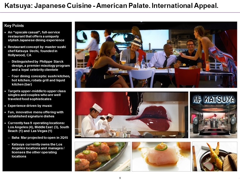 Key Points STK is a reinvention of the traditional steakhouse High - energy dining experience Restaurants built around the bar, featuring DJ played music High female to male customer mix Destination location where guests can utilize our restaurant in multiple ways ─ Main and private dining rooms, bars, lounges, rooftops Superior quality of a traditional steakhouse while featuring an innovative menu Designed for Primary Cities STK Rebel ─ STK under brand that maintains unique features, atmosphere and energy ─ Broader menu priced to appeal to a wider market ─ Open for lunch and dinner ─ Designed for Primary & Secondary cities STK: Differentiated Steakhouse with High - Energy & Great Atmosphere 8