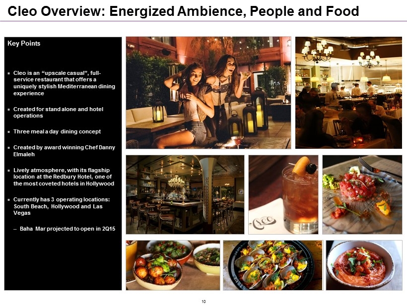 Katsuya: Japanese Cuisine - American Palate. International Appeal. Key Points An “upscale casual”, full - service restaurant that offers a uniquely stylish Japanese dining experience Restaurant concept by master sushi chef Katsuya Uechi , founded in Hollywood, CA ─ Distinguished by Philippe Starck design, a premier mixology program and a loyal celebrity clientele ─ Four dining concepts: sushi kitchen, hot kitchen, robata grill and liquid kitchen (bar) Targets upper - middle to upper class singles and couples who are well traveled food sophisticates Experience driven by music Fun , innovative menu offering with established signature dishes Currently has 9 operating locations: Los Angeles (4), Middle East (3), South Beach (1 ) and Las Vegas (1 ) ─ Baha Mar projected to open in 2Q15 ─ Katsuya currently owns the Los Angeles locations and manages / licenses the other operating locations 9