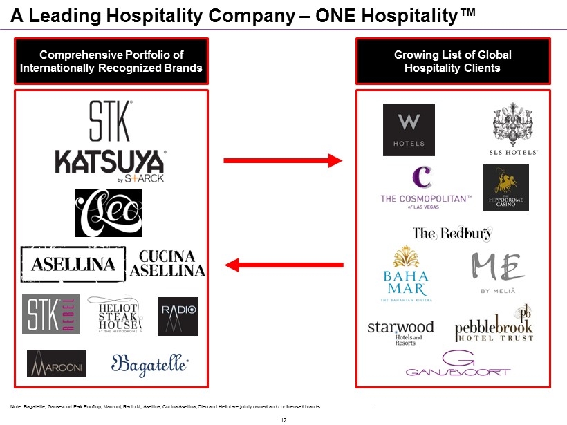 46 Venues Expected to be Opened by end of 2015 Note: Hospitality F&B refers to F&B restaurants, rooftops, pools, bars and hospitality F&B services. STK Katsuya F &B Restaurants STK – Atlanta Brentwood, LA Cucina Asellina – Atlanta STK – DC Downtown, LA Bagatelle – New York STK – Downtown NY Hollywood, LA Bagatelle – Los Angeles STK – Midtown NY Glendale, LA W Hotel - Los Angeles STK – Rooftop NY STK STK – Miami The Hideout STK – Disney World Hospitality Services STK – Chicago STK Rebel – Denver Owned Venues Managed / Licensed Venues STK Cucina Asellina STK STK Rebel Radio Hospitality Services Radio Hospitality Services Marconi Hospitality Services Heliot Steak Asellina STK Lola’s Bar & Casino Plunge Hospitality Services Hospitality Services Cleo Cleo ME - London ME - Milan ME - Miami Hippodrome Gansevoort Cosmopolitan Redbury - Hollywood Redbury - South Beach Cleo Cleo Katsuya SLS - Las Vegas SLS - South Beach Middle East (Arabella, Dubai, Kuwait) Katsuya Cleo Katsuya - Alshaya License SLS - Baha Mar 11