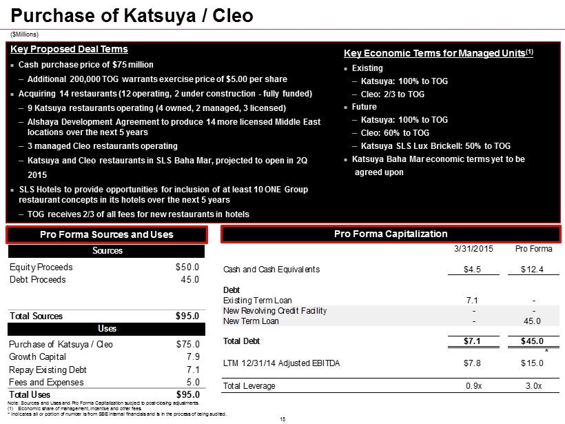 Multiple Avenues for Future Growth Owned STK : Opportunity to open up to 50 STK restaurants globally Targeting 2 - 3 STK restaurants per year, short - term STK Rebel : Opportunity to open at least 100 STK Rebel restaurants globally Targeting 1 - 2 STK Rebel restaurants per year, short - term Katsuya : Ability to put Katsuya in any STK city Targeting 1 - 2 Katsuya restaurants per year, short - term Hospitality Hospitality Management Agreements : Opportunity for at least 50 hospitality management agreements globally, 2 - 3 per city Targeting 1 - 2 hospitality management agreements per year, short - term SLS Hotels to provide opportunities for inclusion of at least 10 ONE Group restaurant concepts in its hotels over the next 5 years Licensed Licensing Deals : Contracted with Alshaya in the Middle East for 10 years for multiple restaurants Currently three Katsuya restaurants operating in the Middle East Development Agreement to open 14 additional Middle East locations over the next 5 years Exploring additional licenses for other ONE Group brands in the Middle East ~$67* million Pro Forma Sales at Owned Units ~$106* million Pro Forma Sales at Managed Units ~$15* million Pro Forma Sales at Licensed Units Note: Sales at owned and managed units pro forma FYE 12/31/2014 and include sales at licensed units, as applicable. * Indicates all or portion of number is from SBE internal financials and is in the process of being audited. 14