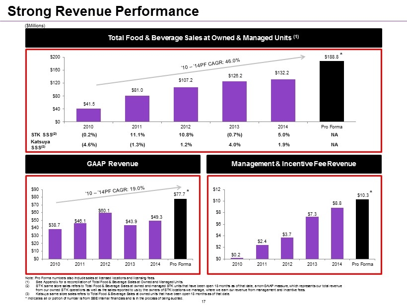Ability to Leverage G&A and Enhance Profitability Growth (12) Public Company (4) ▪ Chief Operating Officer ▪ Director of SEC Reporting ▪ VP Restaurant Operations ▪ General Counsel ▪ Directors of Operations (4) ▪ Support Staff (2) ▪ Senior Managers (2) ▪ Operational Support Staff (4) Acquire highly profitable restaurant brands Ability to leverage existing infrastructure with minimal incremental G&A required Katsuya and Cleo profitability accrues to bottom line Recent G&A Investments TOG Pro Forma P&L Acquisition is Highly Margin & EPS Accretive * Indicates all or portion of number is from SBE internal financials and is in the process of being audited. FY 2014A FY 2016P STKS Katsuya / Cleo Pro Forma Adjusted EBITDA to TOG $7.8 $7.2 $15.0 % Margin 15.8% 25.5% 19.3% D&A (1.4) (1.4) (2.8) 0.0 0.0 0.0 Net Interest Expense (0.1) (2.7) (2.8) 0 0 0.0 Provision from Taxes (0.8) (0.9) (1.8) Adj. Net Income (Loss) from Continuing Ops 2.0 2.2 4.2 Less: NCI (0.5) (0.5) Adj. Net Income (Loss) to The ONE Group $1.5 $3.7 Diluted Shares Outstanding 24.9 10.0 34.9 EPS $0.06 $0.11 Accretion / (Dilution) $0.05 % Accretion / (Dilution) 76.0% * * 16