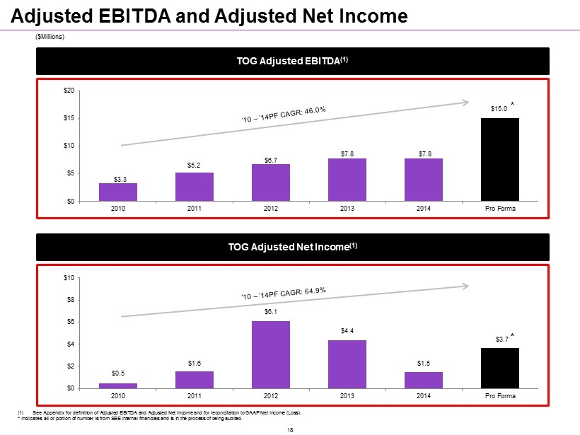 TOG Adjusted Net Income (1) TOG Adjusted EBITDA (1) (1) See Appendix for definition of Adjusted EBITDA and Adjusted Net Income and for reconciliation to GAAP Net Income (Loss). * Indicates all or portion of number is from SBE internal financials and is in the process of being audited. Adjusted EBITDA and Adjusted Net Income ($Millions) $3.3 $5.2 $6.7 $7.8 $7.8 $15.0 $0 $5 $10 $15 $20 2010 2011 2012 2013 2014 Pro Forma $0.5 $1.6 $6.1 $4.4 $1.5 $3.7 $0 $2 $4 $6 $8 $10 2010 2011 2012 2013 2014 Pro Forma * * 18