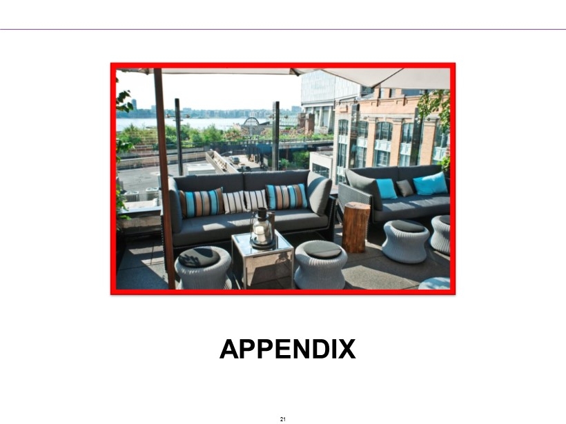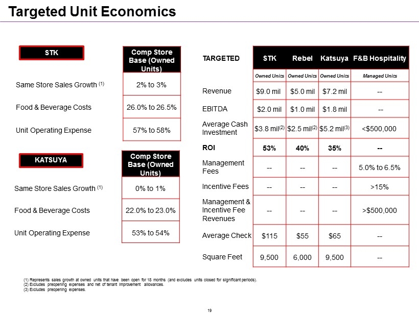 TARGETED STK Rebel Katsuya F&B Hospitality Owned Units Owned Units Owned Units Managed Units Revenue $9.0 mil $5.0 mil $7.2 mil -- EBITDA $2.0 mil $1.0 mil $1.8 mil -- Average Cash Investment $3.8 mil (2) $2.5 mil (2) $5.2 mil (3) <$500,000 ROI 53% 40% 35% -- Management Fees -- -- -- 5.0% to 6.5% Incentive Fees -- -- -- >15% Management & Incentive Fee Revenues -- -- -- >$500,000 Average Check $115 $55 $65 -- Square Feet 9,500 6,000 9,500 -- (1) Represents sales growth at owned units that have been open for 18 months (and excludes units closed for significant perio ds) . n (2) Excludes preopening expenses and net of tenant improvement allowances. N (3) Excludes preopening expenses. Comp Store Base (Owned Units) Same Store Sales Growth (1) 2% to 3% Food & Beverage Costs 26.0% to 26.5% Unit Operating Expense 57% to 58% Targeted Unit Economics STK KATSUYA Comp Store Base (Owned Units) Same Store Sales Growth (1) 0% to 1% Food & Beverage Costs 22.0% to 23.0% Unit Operating Expense 53% to 54% 19