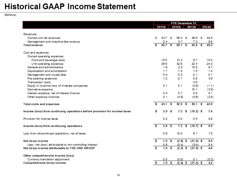 ($ Millions ) Historical GAAP Income Statement FYE December 31, 2011A 2012A 2013A 2014A Revenues: Owned unit net revenues 43.7$ 56.4$ 36.6$ 40.5$ Management and incentive fee revenue 2.4 3.7 7.3 8.8 Total revenue 46.1$ 60.1$ 43.9$ 49.3$ Cost and expenses: Owned operating expenses: Food and beverage costs 10.5 14.3 9.7 10.4 Unit operating expenses 26.9 32.6 22.4 24.3 General and administrative 1.9 2.2 10.8 8.7 Depreciation and amortization 1.7 7.4 1.5 1.4 Management and royalty fees 0.4 0.3 0.1 0.1 Pre-opening expenses 1.2 0.1 0.8 3.9 Transaction costs 4.6 - Equity in (income) loss of investee companies 0.1 0.1 (0.9) (1.1) Derivative expense 10.1 (3.9) Interest expense, net of interest income 0.4 0.7 0.8 0.1 Other expense (income) 0.1 (4.8) (0.6) (2.0) Total costs and expenses 43.1$ 52.9$ 59.1$ 42.0$ Income (loss) from continuing operations before provision for income taxes 3.0$ 7.2$ (15.2)$ 7.4$ Provision for income taxes 0.2 0.0 0.5 0.8 Income (loss) from continuing operations 2.8$ 7.2$ (15.7)$ 6.5$ Loss from discontinued operations, net of taxes 0.9 10.0 6.1 1.5 Net (loss) income 1.9$ (2.8)$ (21.9)$ 5.0$ Less: net (loss) attributable to non-controlling interest 0.9 (0.4) (0.4) 0.4 Net (loss) income attributable to THE ONE GROUP 1.0$ (2.3)$ (21.5)$ 4.6$ Other comprehensive income (loss) Currency translation adjustment 0.0 (0.0) 0.1 (0.3) Comprehensive (loss) income 1.0$ (2.4)$ (21.4)$ 4.4$ 23