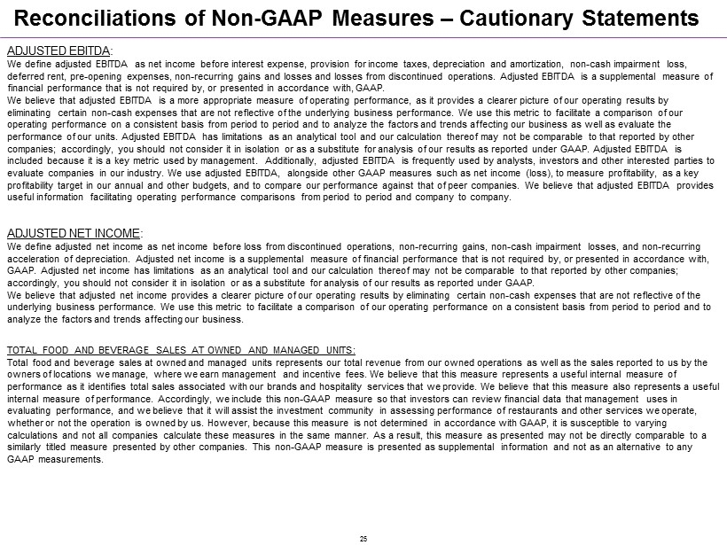 ADJUSTED EBITDA : We define adjusted EBITDA as net income before interest expense, provision for income taxes, depreciation and amortization, n on - cash impairment loss, deferred rent, pre - opening expenses, non - recurring gains and losses and losses from discontinued operations. Adjusted EBITDA is a supplemental measure of financial performance that is not required by, or presented in accordance with, GAAP. We believe that adjusted EBITDA is a more appropriate measure of operating performance, as it provides a clearer picture of o ur operating results by eliminating certain non - cash expenses that are not reflective of the underlying business performance. We use this metric to faci litate a comparison of our operating performance on a consistent basis from period to period and to analyze the factors and trends affecting our busines s a s well as evaluate the performance of our units. Adjusted EBITDA has limitations as an analytical tool and our calculation thereof may not be compar abl e to that reported by other companies; accordingly, you should not consider it in isolation or as a substitute for analysis of our results as reported un der GAAP. Adjusted EBITDA is included because it is a key metric used by management. Additionally, adjusted EBITDA is frequently used by analysts, investo rs and other interested parties to evaluate companies in our industry. We use adjusted EBITDA, alongside other GAAP measures such as net income (loss), to measu re profitability, as a key profitability target in our annual and other budgets, and to compare our performance against that of peer companies. We belie ve that adjusted EBITDA provides useful information facilitating operating performance comparisons from period to period and company to company. ADJUSTED NET INCOME : We define adjusted net income as net income before loss from discontinued operations, non - recurring gains, non - cash impairment l osses, and non - recurring acceleration of depreciation. Adjusted net income is a supplemental measure of financial performance that is not required by, or presented in accordance with, GAAP. Adjusted net income has limitations as an analytical tool and our calculation thereof may not be comparable to that rep ort ed by other companies; accordingly, you should not consider it in isolation or as a substitute for analysis of our results as reported under GAAP. We believe that adjusted net income provides a clearer picture of our operating results by eliminating certain non - cash expenses that are not reflective of the underlying business performance. We use this metric to facilitate a comparison of our operating performance on a consistent b asi s from period to period and to analyze the factors and trends affecting our business. TOTAL FOOD AND BEVERAGE SALES AT OWNED AND MANAGED UNITS: Total food and beverage sales at owned and managed units represents our total revenue from our owned operations as well as th e s ales reported to us by the owners of locations we manage, where we earn management and incentive fees. We believe that this measure represents a useful int ernal measure of performance as it identifies total sales associated with our brands and hospitality services that we provide. We believe that th is measure also represents a useful internal measure of performance. Accordingly, we include this non - GAAP measure so that investors can review financial data that management uses in evaluating performance, and we believe that it will assist the investment community in assessing performance of restaurants a nd other services we operate, whether or not the operation is owned by us. However, because this measure is not determined in accordance with GAAP, it is s usc eptible to varying calculations and not all companies calculate these measures in the same manner. As a result, this measure as presented may no t b e directly comparable to a similarly titled measure presented by other companies. This non - GAAP measure is presented as supplemental information and not as an alternative to any GAAP measurements. Reconciliations of Non - GAAP Measures – Cautionary Statements 25