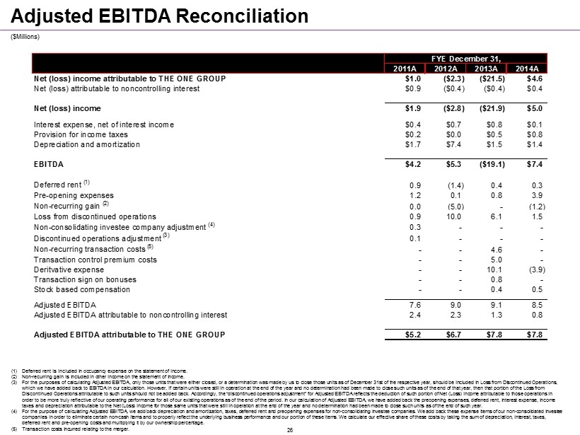 ($ Millions ) (1) Deferred rent is included in occupancy expense on the statement of income. (2) Non - recurring gain is included in other income on the statement of income. (3) For the purposes of calculating Adjusted EBITDA, only those units that were either closed, or a determination was made by us to close those units as of December 31st of the respective year, should be included in Loss from Discontinued Operations, which we have added back to EBITDA in our calculation. However, if certain units were still in operation at the end of the year and no determination had been made to close such units as of the end of that year, then that portion of the Loss from Discontinued Operations attributable to such units should not be added back. Accordingly, the “discontinued operations adjustment” for Adjusted EBITDA reflects the deduction of such portion of Net (Loss) Income attributable to those operations in order to be more truly reflective of our operating performance for all of our existing operations as of the end of the period. In our calculation of Adjusted EBITDA, we have added back the preopening expenses, deferred rent, interest expense, income taxes and depreciation attributable to the Net ( Loss) Income for those same units that were still in operation at the end of the year and no determination had been made to close such units as of the end of such year . (4) For the purpose of calculating Adjusted EBITDA, we add back depreciation and amortization, taxes, deferred rent and preopening expenses for non - consolidating investee companies. We add back these expense items of our non - consolidated investee companies in order to eliminate certain non - cash items and to properly reflect the underlying business performance and our portion of these items. We calculate our effective share of these costs by taking the sum of depreciation, interest, taxes, deferred rent and pre - opening costs and multiplying it by our ownership percentage . (5) Transaction costs incurred relating to the merger. Adjusted EBITDA Reconciliation FYE December 31, 2011A 2012A 2013A 2014A Net (loss) income attributable to THE ONE GROUP $1.0 ($2.3) ($21.5) $4.6 Net (loss) attributable to noncontrolling interest $0.9 ($0.4) ($0.4) $0.4 Net (loss) income $1.9 ($2.8) ($21.9) $5.0 Interest expense, net of interest income $0.4 $0.7 $0.8 $0.1 Provision for income taxes $0.2 $0.0 $0.5 $0.8 Depreciation and amortization $1.7 $7.4 $1.5 $1.4 EBITDA $4.2 $5.3 ($19.1) $7.4 Deferred rent (1) 0.9 (1.4) 0.4 0.3 Pre-opening expenses 1.2 0.1 0.8 3.9 Non-recurring gain (2) 0.0 (5.0) - (1.2) Loss from discontinued operations 0.9 10.0 6.1 1.5 Non-consolidating investee company adjustment (4) 0.3 - - - Discontinued operations adjustment (3) 0.1 - - - Non-recurring transaction costs (5) - - 4.6 - Transaction control premium costs - - 5.0 - Deritvative expense - - 10.1 (3.9) Transaction sign on bonuses - - 0.8 - Stock based compensation - - 0.4 0.5 Adjusted EBITDA 7.6 9.0 9.1 8.5 Adjusted EBITDA attributable to noncontrolling interest 2.4 2.3 1.3 0.8 Adjusted EBITDA attributable to THE ONE GROUP $5.2 $6.7 $7.8 $7.8 26