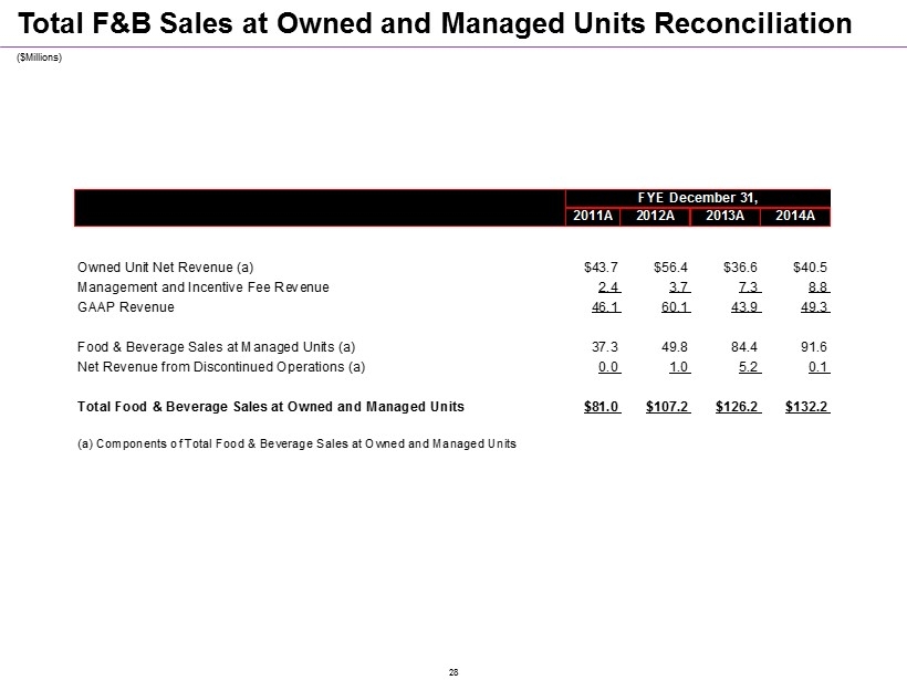 Total F&B Sales at Owned and Managed Units Reconciliation ($ Millions ) FYE December 31,2011A 2012A 2013A 2014A Owned Unit Net Revenue (a) $43.7 $56.4 $36.6 $40.5 Management and Incentive Fee Revenue 2.4 3.7 7.3 8.8 GAAP Revenue 46.1 60.1 43.9 49.3 Food & Beverage Sales at Managed Units (a) 37.3 49.8 84.4 91.6 Net Revenue from Discontinued Operations (a) 0.0 1.0 5.2 0.1 Total Food & Beverage Sales at Owned and Managed Units $81.0 $107.2 $126.2 $132.2 (a) Components of Total Food & Beverage Sales at Owned and Managed Units 28