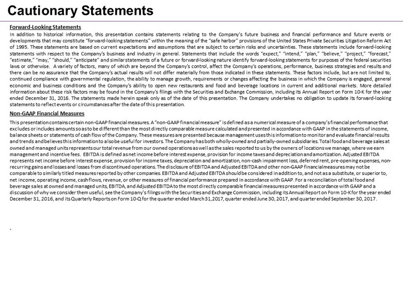 Forward - Looking Statements In addition to historical information, this presentation contains statements relating to the Company’s future business and financial performance and future events or developments that may constitute “forward - looking statements” within the meaning of the “safe harbor” provisions of the United States Private Securities Litigation Reform Act of 1995 . These statements are based on current expectations and assumptions that are subject to certain risks and uncertainties . These statements include forward - looking statements with respect to the Company’s business and industry in general . Statements that include the words “expect,” “intend,” “plan,” “believe,” “project,” “forecast,” “estimate,” “may,” “should,” “anticipate” and similar statements of a future or forward - looking nature identify forward - looking statements for purposes of the federal securities laws or otherwise . A variety of factors, many of which are beyond the Company’s control, affect the Company’s operations, performance, business strategies and results and there can be no assurance that the Company’s actual results will not differ materially from those indicated in these statements . These factors include, but are not limited to, continued compliance with governmental regulation, the ability to manage growth, requirements or changes affecting the business in which the Company is engaged, general economic and business conditions and the Company’s ability to open new restaurants and food and beverage locations in current and additional markets . More detailed information about these risk factors may be found in the Company’s filings with the Securities and Exchange Commission, including its Annual Report on Form 10 - K for the year ended December 31 , 2016 . The statements made herein speak only as of the date of this presentation . The Company undertakes no obligation to update its forward - looking statements to reflect events or circumstances after the date of this presentation . Non - GAAP Financial Measures This presentation contains certain non - GAAP financial measures. A “non - GAAP financial measure” is defined as a numerical measure of a company’s financial performance that excludes or includes amounts so as to be different than the most directly comparable measure calculated and presented in acco rda nce with GAAP in the statements of income, balance sheets or statements of cash flow of the Company. These measures are presented because management uses this informati on to monitor and evaluate financial results and trends and believes this information to also be useful for investors. The Company has both wholly - owned and partially - owned subsidiaries. Total food and beverage sales at owned and managed units represents our total revenue from our owned operations as well as the sales reported to us by the own ers of locations we manage, where we earn management and incentive fees. EBITDA is defined as net income before interest expense, provision for income taxes and depre cia tion and amortization. Adjusted EBITDA represents net income before interest expense, provision for income taxes, depreciation and amortization, non - cash impairment lo ss, deferred rent, pre - opening expenses, non - recurring gains and losses and losses from discontinued operations. The disclosure of EBITDA and Adjusted EBITDA and other non - GAAP financial measures may not be comparable to similarly titled measures reported by other companies. EBITDA and Adjusted EBITDA should be considered in addit ion to, and not as a substitute, or superior to, net income, operating income, cash flows, revenue, or other measures of financial performance prepared in accordance with GAA P. For a reconciliation of total food and beverage sales at owned and managed units, EBITDA, and Adjusted EBITDA to the most directly comparable financial measures pre sen ted in accordance with GAAP and a discussion of why we consider them useful, see the Company’s filings with the Securities and Exchange Commission, including its Annual Report on Form 10 - K for the year ended December 31, 2016, and its Quarterly Reports on Form 10 - Q for the quarter ended March 31,2017, quarter ended June 30, 2017, and quarter ended September 30, 2017. . Cautionary Statements