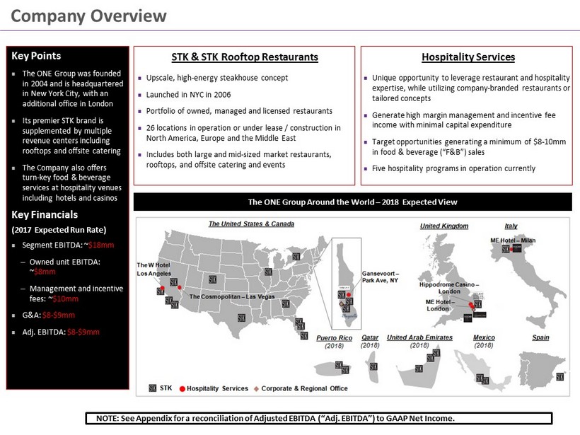 Company Overview 7 STK & STK Rooftop Restaurants Upscale, high - energy steakhouse concept Launched in NYC in 2006 Portfolio of owned, managed and licensed restaurants 26 locations in operation or under lease / construction in North America, Europe and the Middle East Includes both large and mid - sized market restaurants, rooftops, and offsite catering and events Hospitality Services Unique opportunity to leverage restaurant and hospitality expertise, while utilizing company - branded restaurants or tailored concepts Generate high margin management and incentive fee income with minimal capital expenditure Target opportunities generating a minimum of $8 - 10mm in food & beverage (“F&B”) sales Five hospitality programs in operation currently The ONE Group Around the World – 2018 Expected View Key Points The ONE Group was founded in 2004 and is headquartered in New York City, with an additional office in London Its premier STK brand is supplemented by multiple revenue centers including rooftops and offsite catering The Company also offers turn - key food & beverage services at hospitality venues including hotels and casinos Key Financials (2017 Expected Run Rate) Segment EBITDA: ~ $18mm ─ Owned unit EBITDA: ~ $8mm ─ Management and incentive fees: ~ $10mm G&A: $8 - $9mm Adj. EBITDA: $8 - $9mm NOTE: See Appendix for a reconciliation of Adjusted EBITDA (“Adj. EBITDA”) to GAAP Net Income.