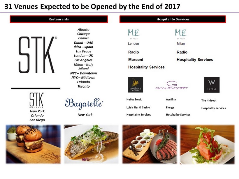 31 Venues Expected to be Opened by the End of 2017 Restaurants Hospitality Services Heliot Steak Asellina The Hideout Lola’s Bar & Casino Plunge Hospitality Services Hospitality Services Hospitality Services Atlanta Chicago Denver Dubai – UAE Ibiza – Spain Las Vegas London – UK Los Angeles Milan – Italy Miami NYC – Downtown NYC – Midtown Orlando Toronto New York Orlando San Diego New York