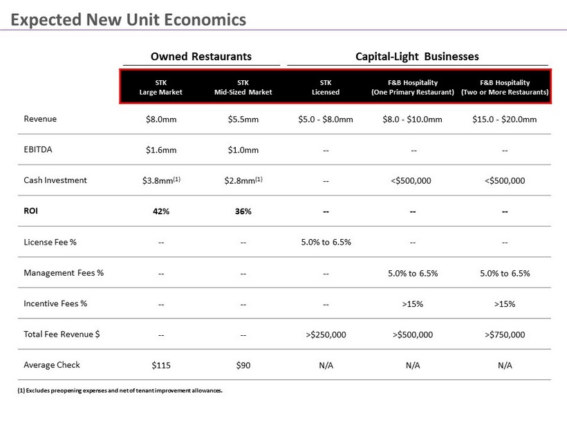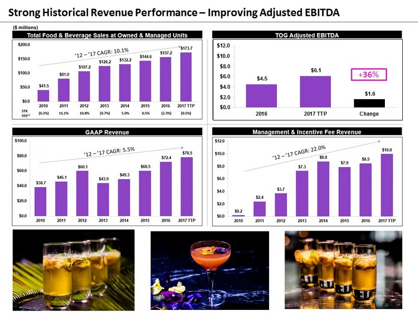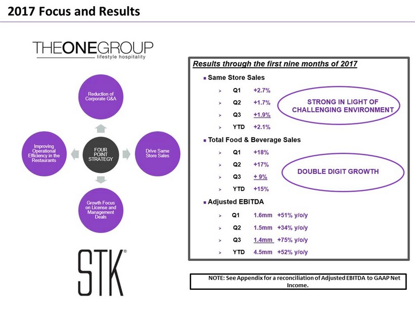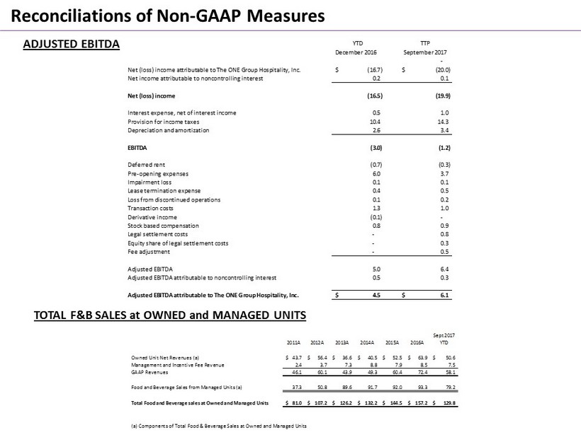 Reconciliations of Non - GAAP Measures YTD TTP December 2016 September 2017 - Net (loss) income attributable to The ONE Group Hospitality, Inc. (16.7)$ (20.0)$ Net income attributable to noncontrolling interest 0.2 0.1 Net (loss) income (16.5) (19.9) Interest expense, net of interest income 0.5 1.0 Provision for income taxes 10.4 14.3 Depreciation and amortization 2.6 3.4 EBITDA (3.0) (1.2) Deferred rent (0.7) (0.3) Pre-opening expenses 6.0 3.7 Impairment loss 0.1 0.1 Lease termination expense 0.4 0.5 Loss from discontinued operations 0.1 0.2 Transaction costs 1.3 1.0 Derivative income (0.1) - Stock based compensation 0.8 0.9 Legal settlement costs - 0.8 Equity share of legal settlement costs - 0.3 Fee adjustment - 0.5 Adjusted EBITDA 5.0 6.4 Adjusted EBITDA attributable to noncontrolling interest 0.5 0.3 Adjusted EBITDA attributable to The ONE Group Hospitality, Inc. 4.5$ 6.1$ 2011A 2012A 2013A 2014A 2015A 2016A Sept 2017 YTD Owned Unit Net Revenues (a) 43.7$ 56.4$ 36.6$ 40.5$ 52.5$ 63.9$ 50.6$ Management and Incentive Fee Revenue 2.4 3.7 7.3 8.8 7.9 8.5 7.5 GAAP Revenues 46.1 60.1 43.9 49.3 60.4 72.4 58.1 Food and Beverage Sales from Managed Units (a) 37.3 50.8 89.6 91.7 92.0 93.3 79.2 Total Food and Beverage sales at Owned and Managed Units 81.0$ 107.2$ 126.2$ 132.2$ 144.5$ 157.2$ 129.8$ (a) Components of Total Food & Beverage Sales at Owned and Managed Units ADJUSTED EBITDA TOTAL F&B SALES at OWNED and MANAGED UNITS