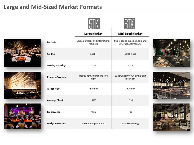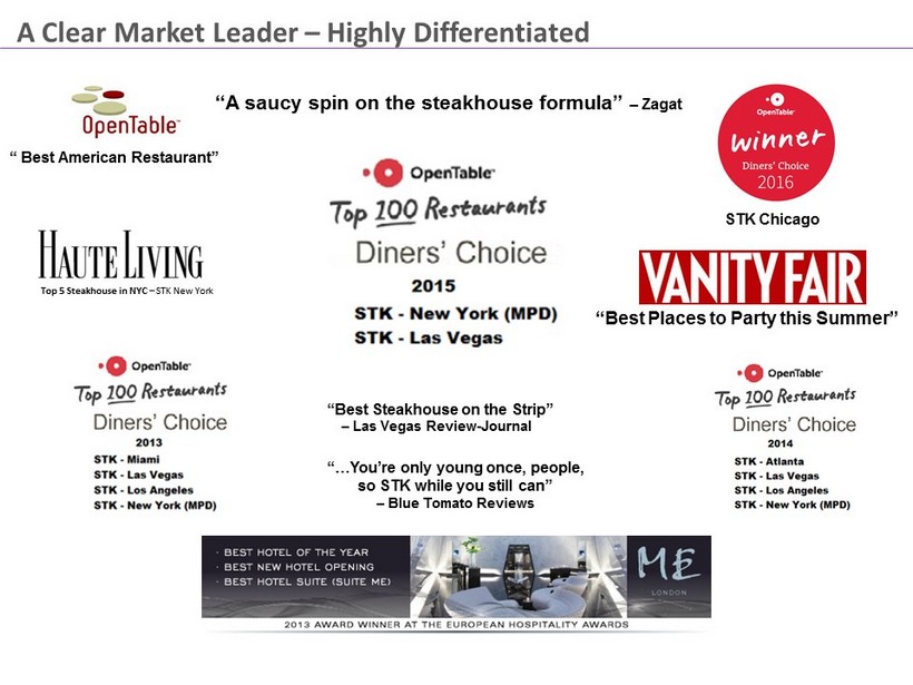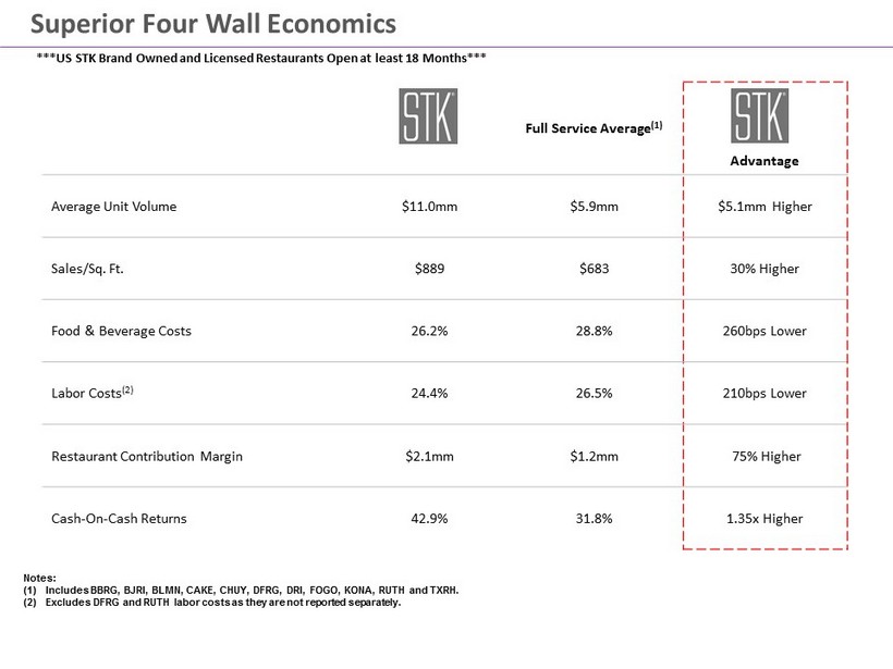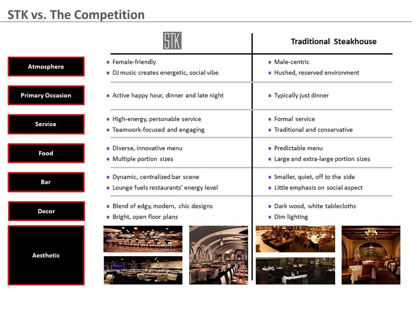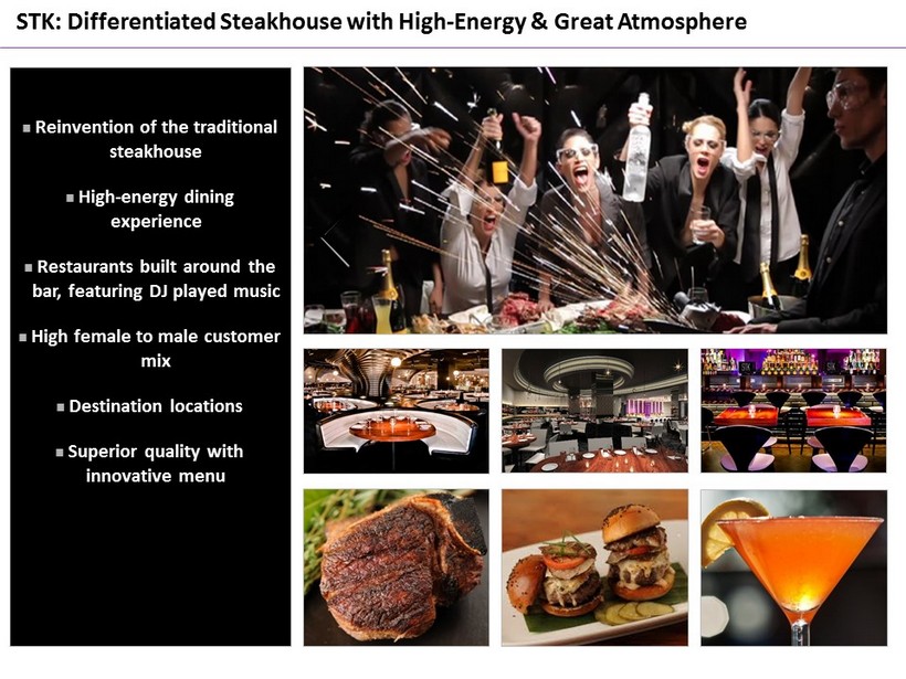 Reinvention of the traditional steakhouse High - energy dining experience Restaurants built around the bar, featuring DJ played music High female to male customer mix Destination locations Superior quality with innovative menu STK: Differentiated Steakhouse with High - Energy & Great Atmosphere