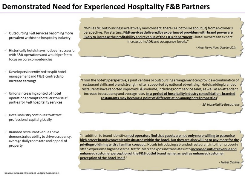 Demonstrated Need for Experienced Hospitality F&B Partners x Outsourcing F&B services becoming more prevalent within the hospitality industry x Historically hotels have not been successful with F&B operations and would prefer to focus on core competencies x Developers incentivized to split hotel management and F & B contracts to increase earnings x Unions increasing control of hotel operations prompts hoteliers to use 3 rd parties for F&B hospitality services x Hotel industry continues to attract professional capital globally x Branded restaurant venues have demonstrated ability to drive occupancy, average daily room rate and appeal of property “While F&B outsourcing is a relatively new concept, there is a lot to like about [it] from an owner's perspective. For starters, F&B services delivered by experienced providers with brand power are likely to increase the profitability and revenue of the F&B department …hotel owners can expect increases in ADR and occupancy levels.” - Hotel News Now, October 2014 Source: American Hotel and Lodging Association. “From the hotel’s perspective, a joint venture or outsourcing arrangement can provide a combination of restaurant skills and brand strength, often supported by national advertising. Hotels adding branded restaurants have reported improved F&B volume, including room service sales, as well as an attendant increase in occupancy and average rate. In a period of hospitality industry consolidation, branded restaurants may become a point of differentiation among hotel properties ” - 3P Hospitality Resources “ In addition to brand identity, most operators find that guests are not only more willing to patronise high - street brands conveniently situated within the hotel, but they are also willing to pay more for the privilege of dining with a familiar concept …Hotels introducing a branded restaurant into their property often experience higher external traffic. Market exposure translates into increased outlet revenue and enhanced customer perception of the F&B outlet brand name, as well as enhanced customer perception of the hotel itself .” - Hotel Online