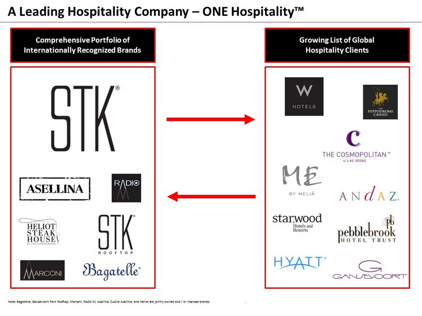 A Leading Hospitality Company – ONE Hospitality™ Note: Bagatelle, Gansevoort Park Rooftop, Marconi, Radio M, Asellina, Cucina Asellina, and Heliot are jointly owned and / or licensed brands. and / or licensed brands . Comprehensive Portfolio of Internationally Recognized Brands Growing List of Global Hospitality Clients
