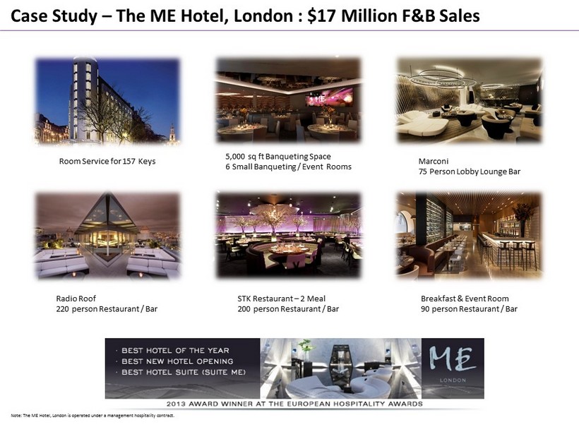 Case Study – The ME Hotel, London : $17 Million F&B Sales Room Service for 157 Keys 5,000 sq ft Banqueting Space 6 Small Banqueting / Event Rooms Marconi 75 Person Lobby Lounge Bar Radio Roof 220 person Restaurant / Bar STK Restaurant – 2 Meal 200 person Restaurant / Bar Breakfast & Event Room 90 person Restaurant / Bar Note: The ME Hotel, London is operated under a management hospitality contract.
