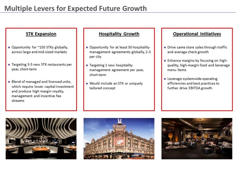 Multiple Levers for Expected Future Growth 35 STK Expansion Opportunity for ~150 STKs globally, across large and mid - sized markets Targeting 3 - 5 new STK restaurants per year, short - term Blend of managed and licensed units, which require lower capital investment and produce high margin royalty, management and incentive fee streams Hospitality Growth Opportunity for at least 50 hospitality management agreements globally, 2 - 3 per city Targeting 1 new hospitality management agreement per year, short - term Would include an STK or uniquely tailored concept Operational Initiatives Drive same store sales through traffic and average check growth Enhance margins by focusing on high - quality, high - margin food and beverage menu items Leverage systemwide operating efficiencies and best practices to further drive EBITDA growth