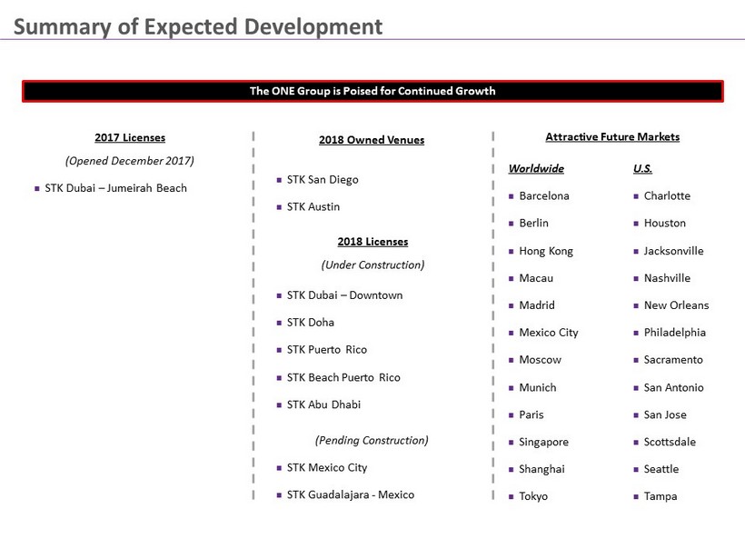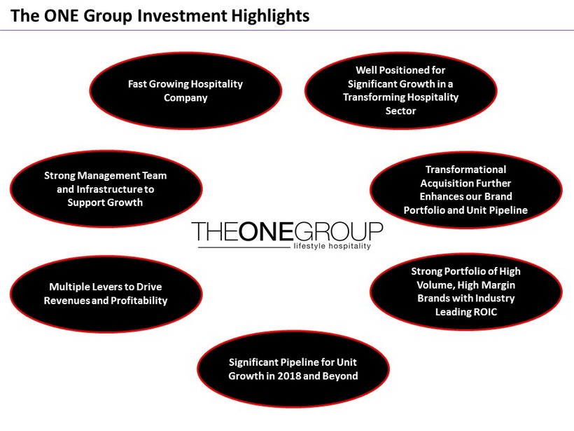 Fast Growing Hospitality Company Transformational Acquisition Further Enhances our Brand Portfolio and Unit Pipeline Strong Management Team and Infrastructure to Support Growth Multiple Levers to Drive Revenues and Profitability Strong Portfolio of High Volume, High Margin Brands with Industry Leading ROIC Significant Pipeline for Unit Growth in 2018 and Beyond Well Positioned for Significant Growth in a Transforming Hospitality Sector The ONE Group Investment Highlights