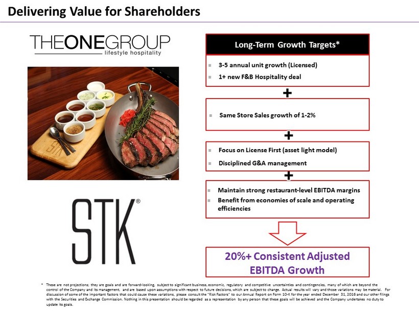 * These are not projections; they are goals and are forward - looking, subject to significant business, economic, regulatory and competitive uncertainties and contingencies, many of which are beyond the control of the Company and its management, and are based upon assumptions with respect to future decisions, which are subject to change. Actual results will vary and those variations may be material. For discussion of some of the important factors that could cause these variations, please consult the “Risk Factors” to our Annua l R eport on Form 10 - K for the year ended December 31, 2016 and our other filings with the Securities and Exchange Commission. Nothing in this presentation should be regarded as a representation by any perso n t hat these goals will be achieved and the Company undertakes no duty to update its goals. 3 - 5 annual unit growth (Licensed) 1+ new F&B Hospitality deal 20%+ Consistent Adjusted EBITDA Growth Long - Term Growth Targets* Same Store Sales growth of 1 - 2 % Maintain strong restaurant - level EBITDA margins Benefit from economies of scale and operating efficiencies Focus on License First (asset light model) Disciplined G&A management Delivering Value for Shareholders