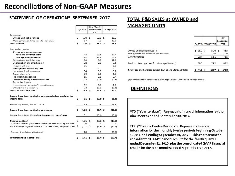 Reconciliations of Non - GAAP Measures STATEMENT OF OPERATIONS SEPTEMBER 2017 TOTAL F&B SALES at OWNED and MANAGED UNITS Q4 2016 Nine Months ended Sept 2017 TTP Sept 2017 Revenues: Owned unit net revenues 18.0$ 50.6$ 68.5$ Management and incentive fee revenue 2.4 7.6 10.0 Total revenue 20.4$ 58.1$ 78.5$ Cost and expenses: Owned operating expenses: Food and beverage costs 4.5 12.9 17.4 Unit operating expenses 11.5 33.2 44.7 General and administrative 3.0 9.8 12.8 Depreciation and amortization 0.8 2.6 3.4 Impairment loss 0.1 0.1 Management and royalty fees - - Lease termination expense 0.4 0.0 0.5 Transaction costs 0.8 0.3 1.0 Pre-opening expenses 1.5 2.1 3.7 Income of equity method investees (0.2) (0.2) (0.3) Derivative income - - Interest expense, net of interest income 0.2 0.8 1.0 Other (income) expense (0.2) (0.1) (0.3) Total costs and expenses 22.5$ 61.5$ 84.0$ Income (loss) from continuing operations before provision for income taxes (2.1)$ (3.3)$ (5.3)$ Provision (benefit) for income tax 13.9 0.4 14.3 Income (loss) from continuing operations (16.0)$ (3.7)$ (19.6)$ Income (loss) from discontinued operations, net of taxes (0.1) (0.1) (0.2) Net income (loss) (16.1)$ (3.8)$ (19.8)$ Less: net income (loss) attributable to noncontrolling interest 0.0 0.1 0.1 Net income (loss) attributable to The ONE Group Hospitality, Inc. (16.1)$ (3.9)$ (20.0)$ Currency translation adjustment (1.0) 0.2 (0.8) Comprehensive income (loss) (17.1)$ (3.7)$ (20.7)$ Q4 2016 YTD Q3 2017 TTP September 2017 Owned Unit Net Revenues (a) 18.0$ 50.6$ 68.5$ Management and Incentive Fee Revenue 2.4 7.6 10.0 GAAP Revenues 20.4 58.1 78.5 Food and Beverage Sales from Managed Units (a) 26.0 79.2 105.2 Total Food and Beverage sales at Owned and Managed Units 44.0$ 129.7$ 173.8$ (a) Components of Total Food & Beverage Sales at Owned and Managed Units YTD (“Year - to - date”). Represents financial Information for the nine months ended September 30, 2017. TTP (“Trailing Twelve Periods”). Represents financial information for the monthly twelve periods beginning October 1, 2016 and ending September 30, 2017. This represents the consolidated GAAP financial results for the fourth quarter ended December 31, 2016 plus the consolidated GAAP financial results for the nine months ended September 30, 2017. DEFINITIONS