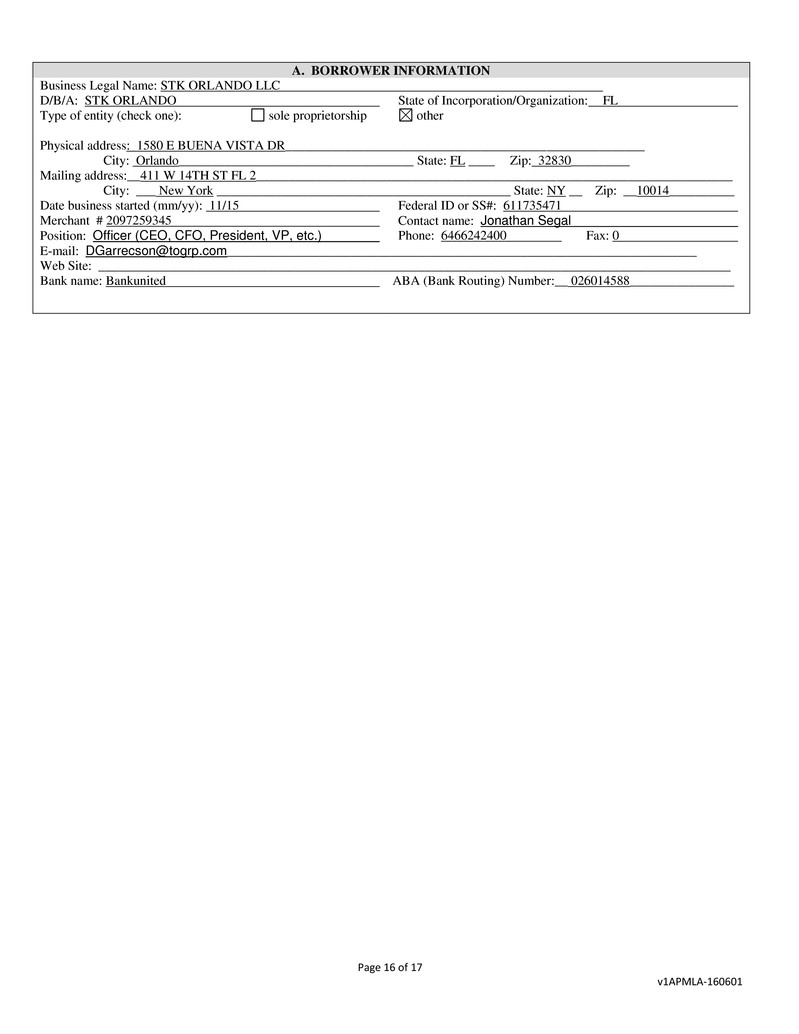 Business Legal Name: STK ORLANDO LLC